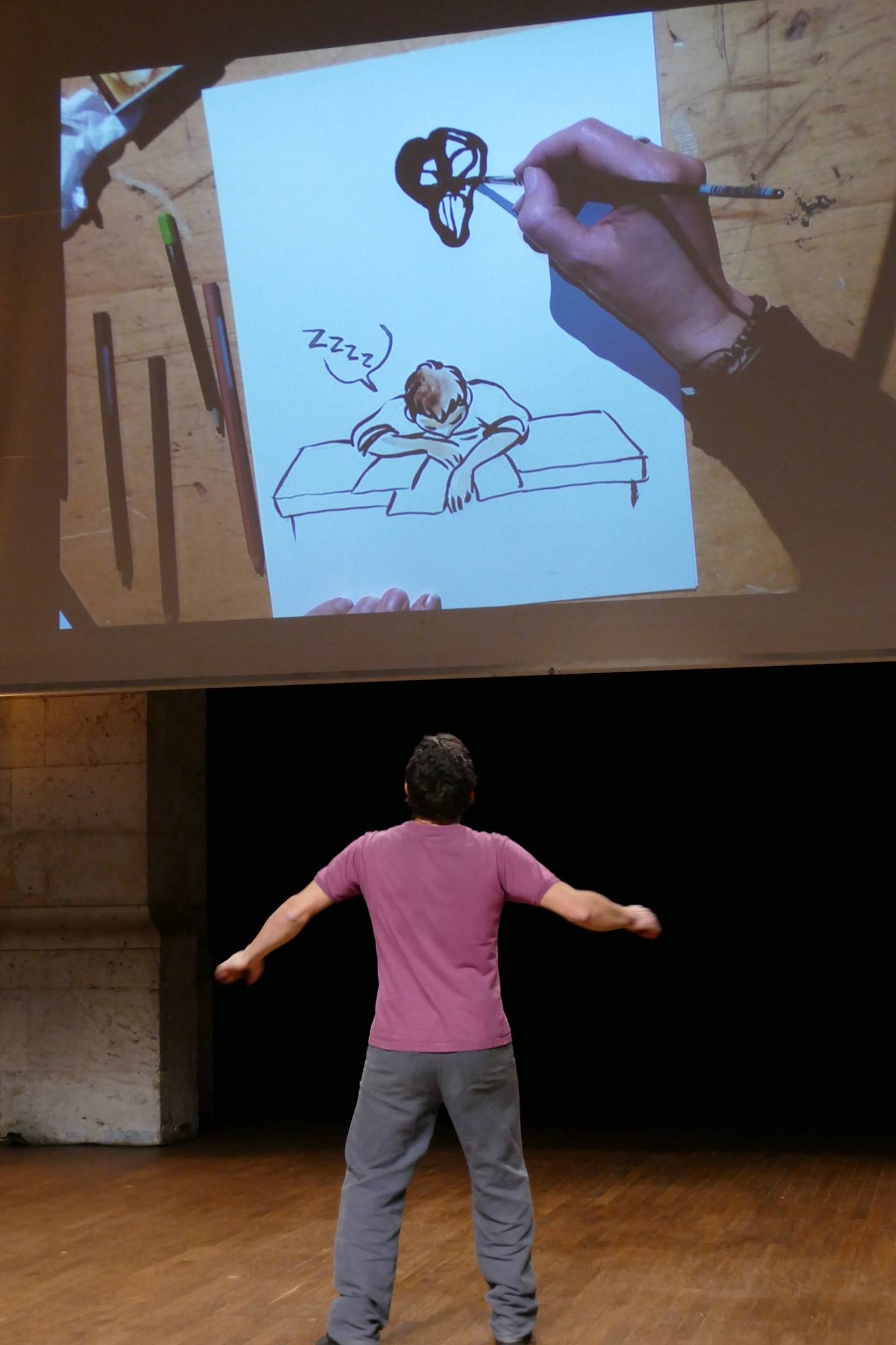 A mi-chemin entre théâtre et performance, il mélange l’art de la scène et la bande-dessinée. Les personnages prennent vie grâce au jeu des comédiens et aux dessins de l’illustrateur qui s’animent en temps réel sur écran géant.